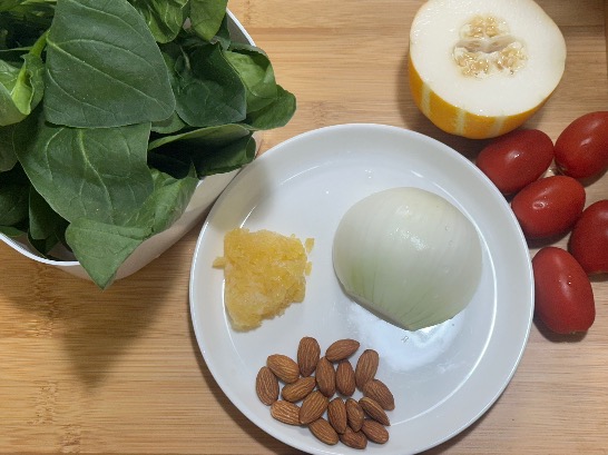 시금치 7뿌리, 올리브유 2T, 다진마늘 2T, 아몬드 10알, 소금1/2T, 후추 10번 갈갈, 그라나파다노치즈 10번 왔다리갔다리