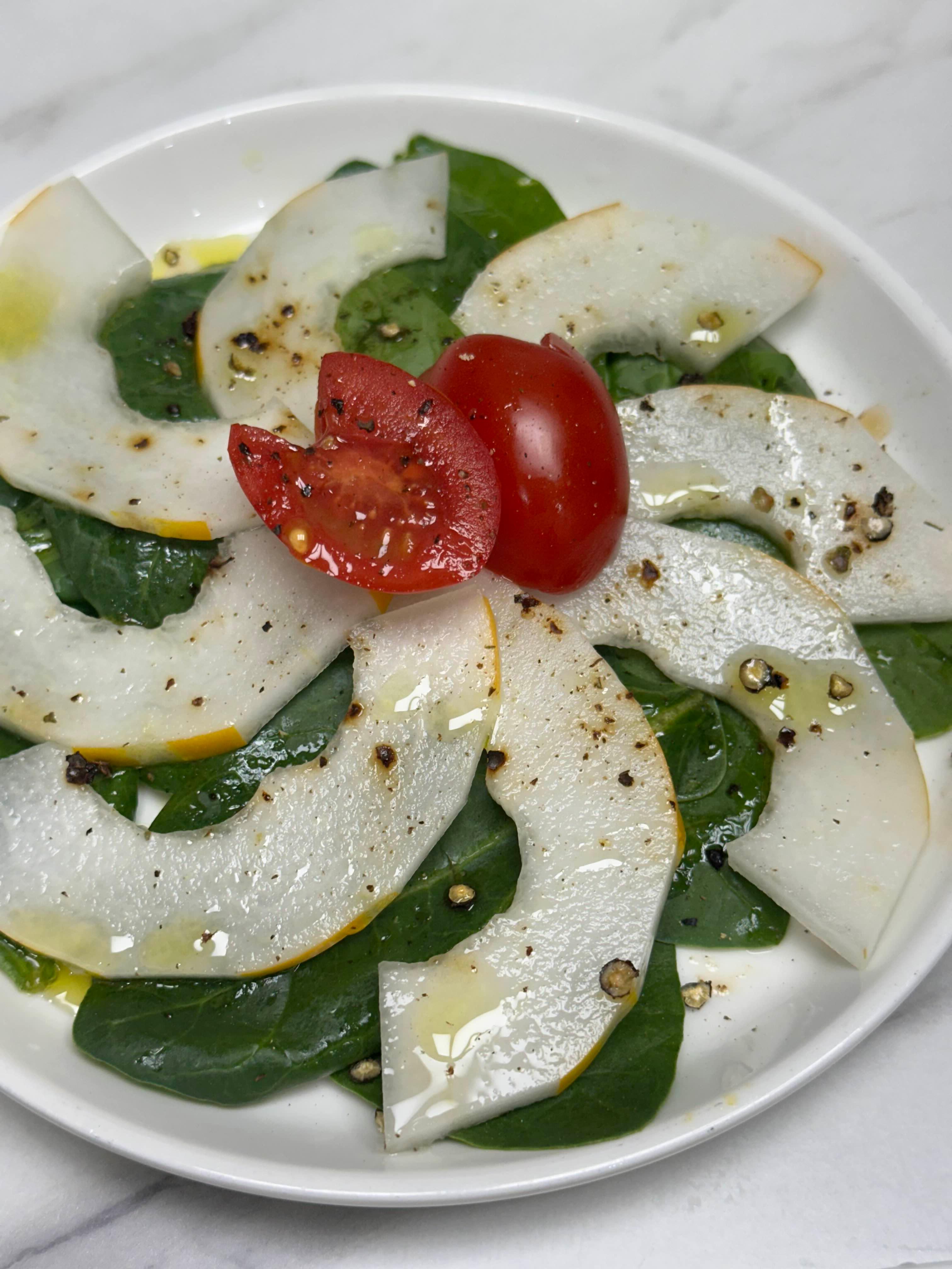 생 시금치를 깔고 얇게 저민 참외를 가지런히 둘러 준 다음