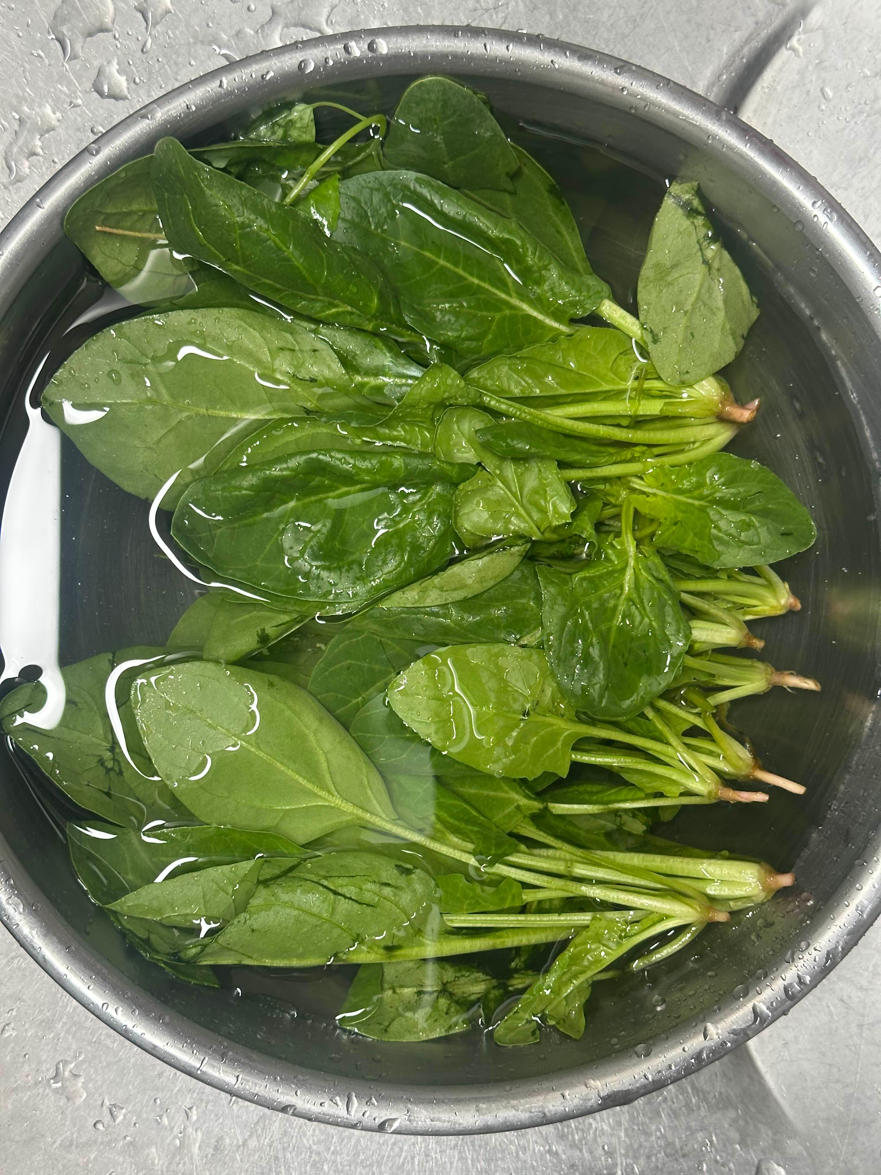 레몬즙 두 번 쪼록 쪼록 넣은 찬물에 시금치를 잠시 담궈 헹군 후 뿌리를 잘라줍니다.